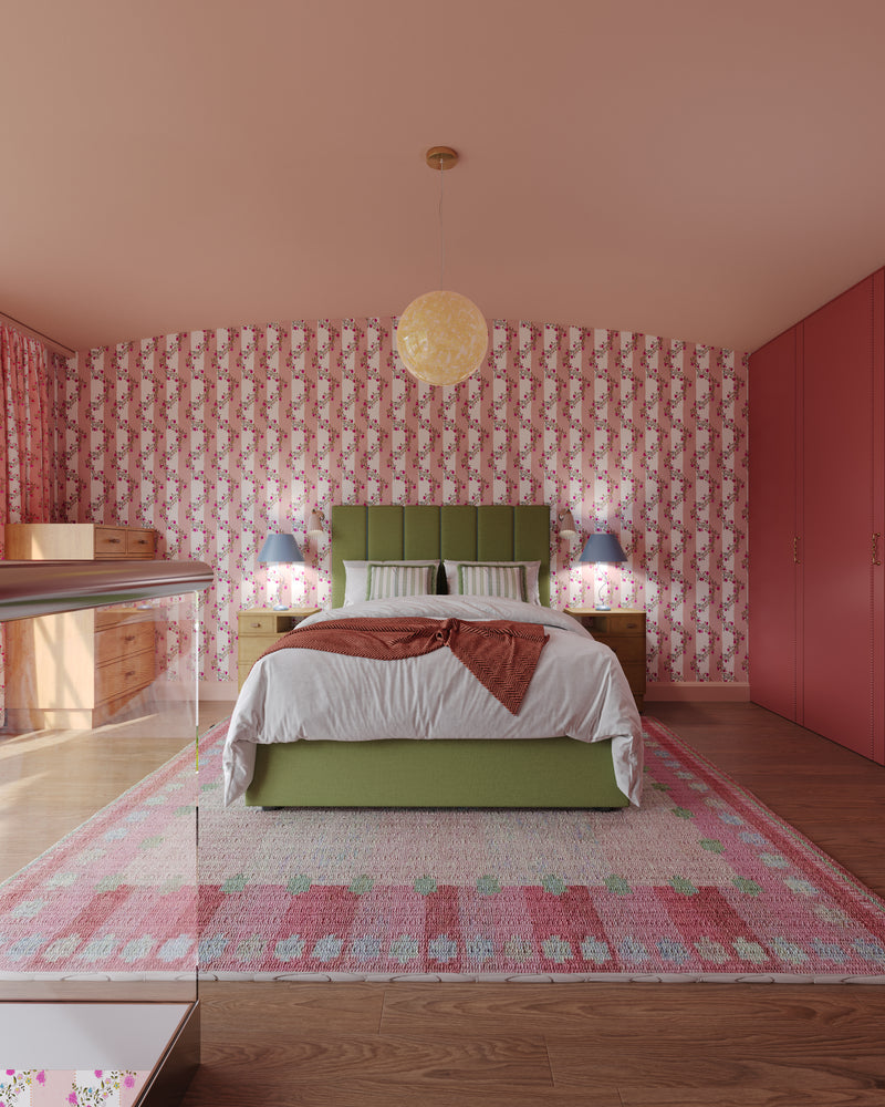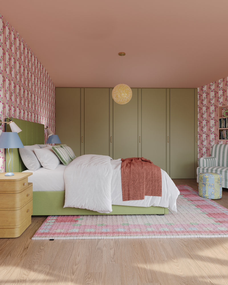 A master bedroom suite with roof top terrace views of Blackheath. A joyful celebration of print and colour. With a bespoke joinery that includes a secret door to an ensuite bathroom.