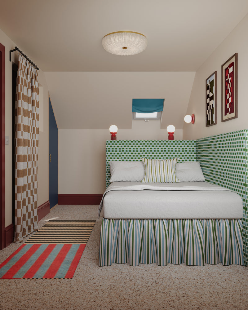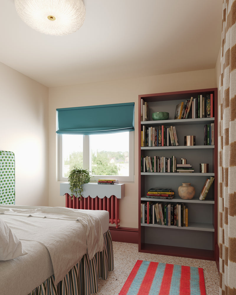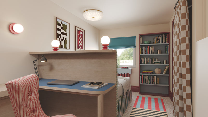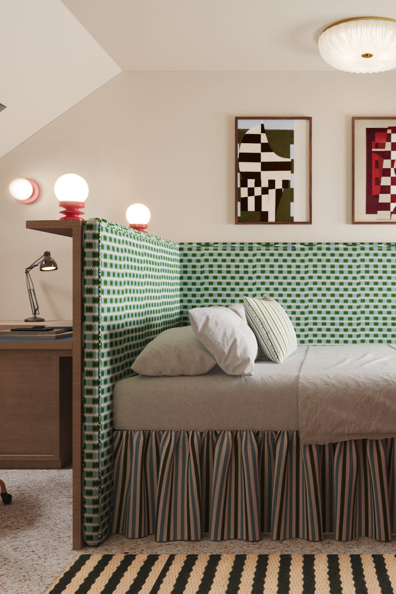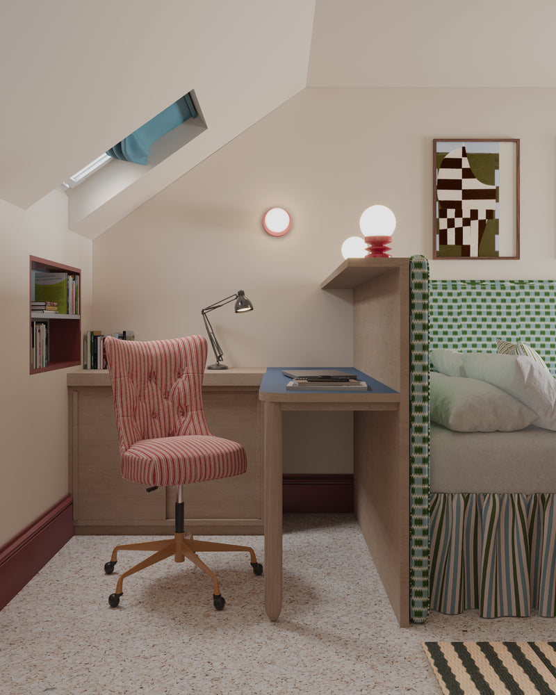A loft conversion bedroom of a contemporary renovated Victorian terrace in Walthamstow, East London. I am always thinking of our mental health when it comes to designing spaces, and I liked the idea that when you wake up in the morning you are facing the window, the birds and the trees. With the desk space neatly constructed behind the bed, out of sight, out of mind. With a bespoke pull out wardrobe and recessed bookshelves and a vibrant use of colour and print to create a less than ordinary bedroom.
