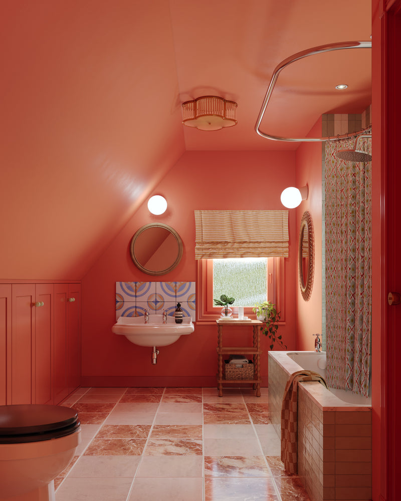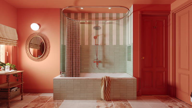 A fully creative remodel and interior design scheme, of the bathroom in this Victorian home. Fully reimagined using warming paint colours and playful tiles around an indulgent large bath.